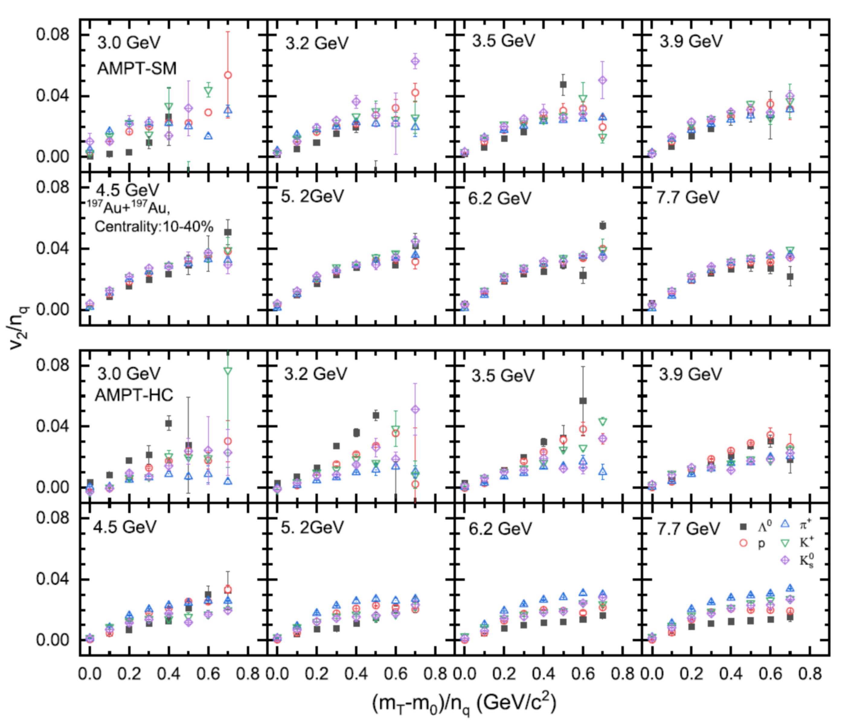 Figure 1. Scaling of hadronic elliptic flow as a function of center-of-mass energy in heavy-ion collisions. The top (bottom) panels show scenarios with (without) QGP formation. (Image from IMP)