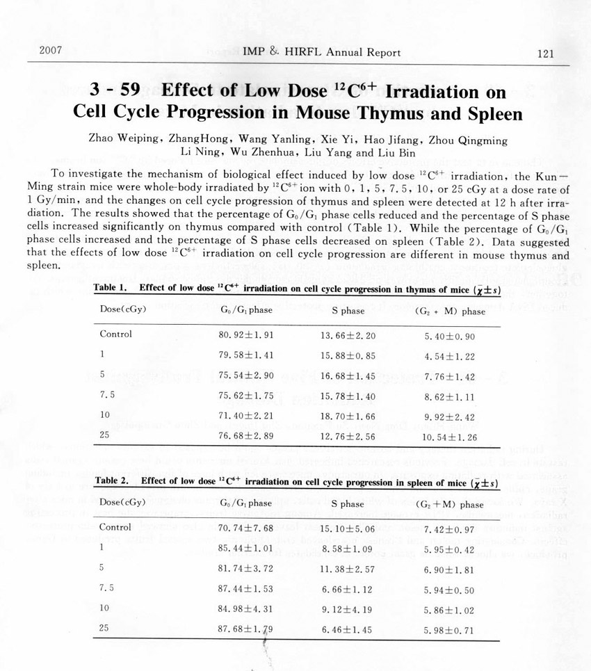 Effect of Low Dose 12C6+ Irradiation on Cell Cycle Progression in Mouse Thymus and Spleen... ... Zhao Weiping et al.(121)