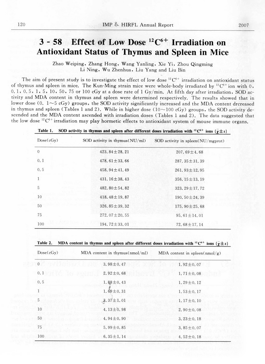 Effect of Low Dose 12C6+ Irradiation on Antioxidant Status of Thymus and Spleen in Mice... ... Zhao Weiping et al.(120)