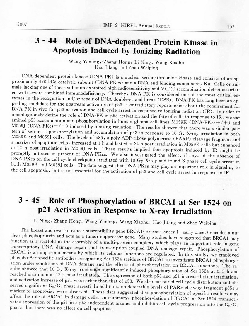 Role of Phosphorylation of BRCA1 at Ser 1524 on p21 Activation in Response to X-ray Irradiation ... ... Li Ning et al.(107)