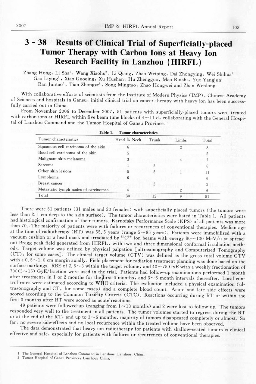 Results of Clinical Trial of Superficially-placed Tumor Therapy with Carbon Ions at Heavy Ion Research Facility in Lanzhou(HIRFL)... ...Zhang Hong et al.(103)