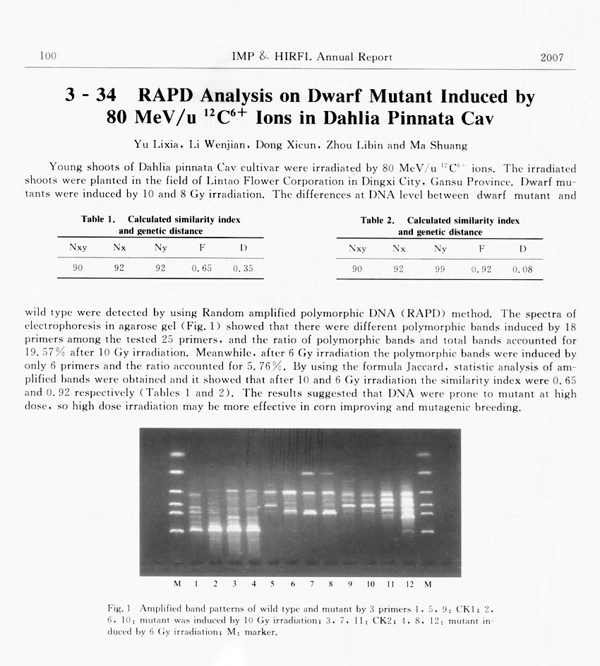 RAPD Analysis on Dwarf Mutant Induced by 80 MeV/u 12C6+ Ions in Dahlia Pinnata Cav.. ...Yu Lixia et al.(100)