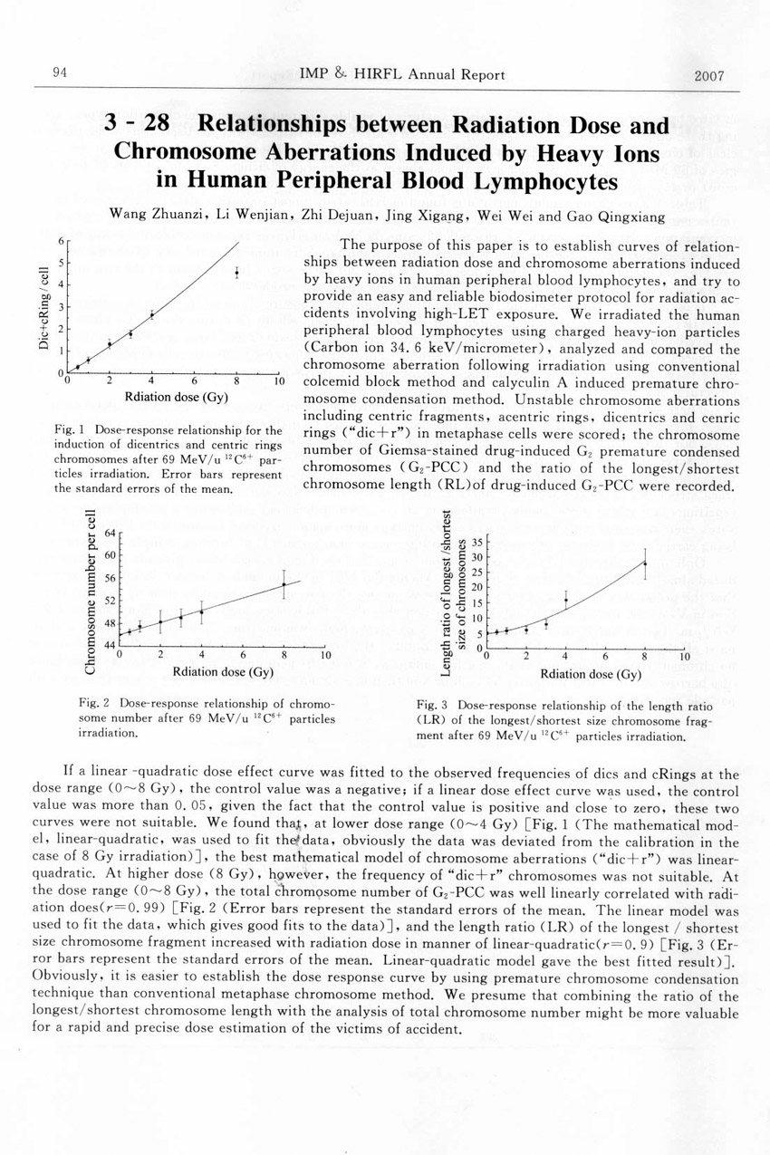 Relationships between Radiation Does and Chromosome Aberrations Induced by Heavy Ions in Human Peripheral Blood Lymphocytes ... ... Wang Zhuanzi et al.(94)