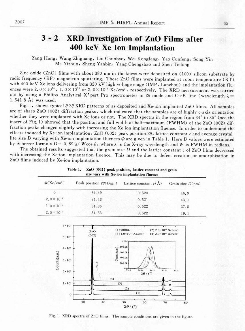 XRD Investigation of ZnO Films after 400 keV Xe Ion Implantation ... ...Zang Hang et al.(65)